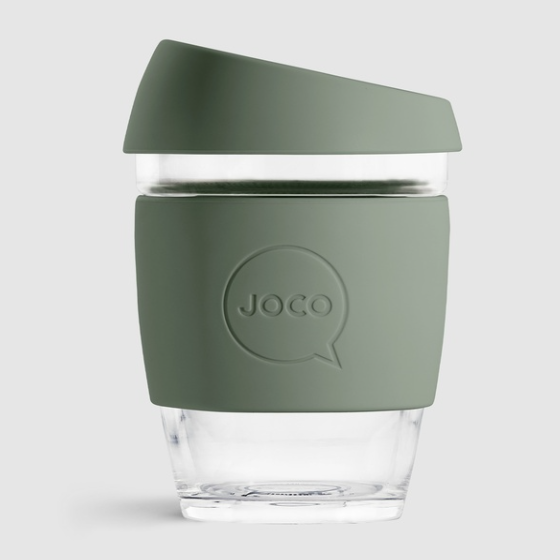 This stylish JOCO reusable coffee cup is artisan blown from borosilicate glass and has the following features: